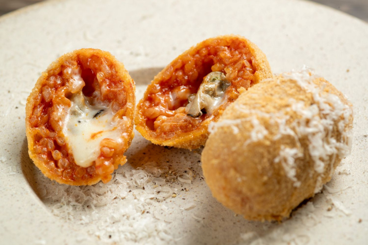 イタリア・ローマ発祥のチーズ入りライスコロッケ「スップリ」をアレンジした「牡蠣とチーズのライスコロッケ」。米をトマトソースと野菜と牡蠣の茹で汁でリゾットに仕立て、丸ごと一粒の牡蠣とモッツァレラチーズを包んで、目の細かいパン粉でカラリと揚げています。仕上げに振ったパルミジャーノ・レッジャーノでチーズ感増し増し!