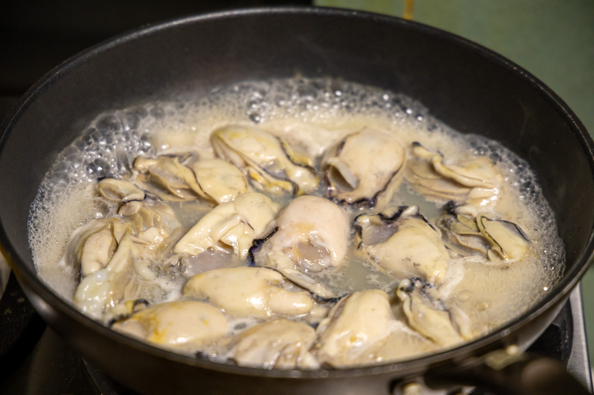 広島名物お好み焼きに広島県産牡蠣をトッピングするというアレンジは、多くの店で見ることができます。しかし、ほとんどは「鉄板で焼いた粒牡蠣をONする」というもの。『のっく』の調理方法は、それとは一線を画しています。まず、牡蠣を鉄板ではなくフライパンで煮焼きに。そこには牡蠣のエキスが大量に抽出され、沸騰する中でその濃度を増していくのです。