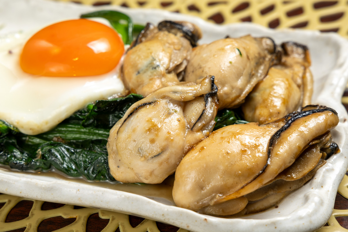 近年、広島のご当地グルメ「ウニホーレン」に似た調理法で「牡蠣ホーレン」を提供する店が増えています。ここ『のっく』もそのひとつですが、目玉焼が添えられているのがうれしいポイント。牡蠣と一緒にホーレン草を炒めるので、こちらも牡蠣のダシがホーレン草によく絡みます。また、ホーレン草の苦みが牡蠣の味わいとマッチして、食材の相性としても非常にバランスが良いのです。