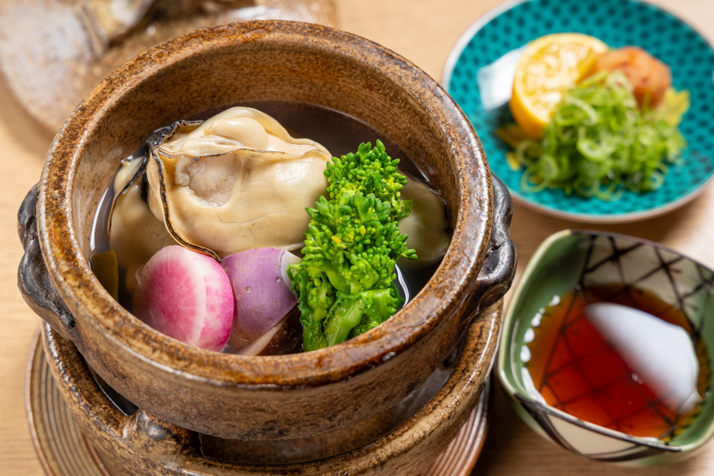 “牡蠣串焼き”の他にも、この店には和食の技を随所に施したメニューがあり、中でも味わってほしいのが「牡蠣と旬菜酒蒸し」。大ぶりな地御前の牡蠣に、昆布だしと野菜の旨みが加わった酒蒸しは、瀬戸内海の恵みを感じられる逸品なのです。