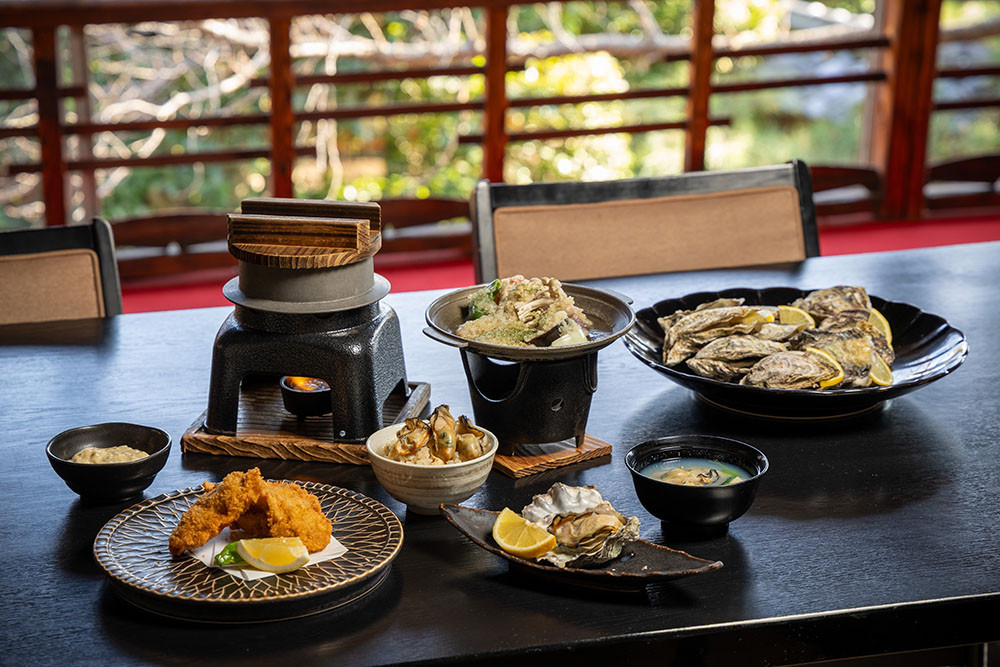 由緒ある歴史を重ねた空間で、窓の外の日本庭園の風を感じながら、目の前には島の幸。牡蠣の料理が並ぶ様子には、思わずため息が出てしまうほど。